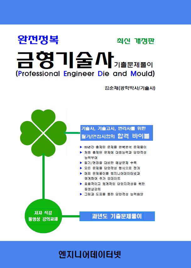 [상세] 학습교재 학습교재 [상세] 학습교재 기술사 / 기계 금형기술사 [최신판] 정가 80,000원 구매가 72,000원 배송비 무료배송 수량 빼기 더하기 총 상품 금액 72,000원 장바구니 바로구매 관련강좌 도서소개 배송/교환/환불 강좌소개 강좌명 강사 정가 완전정복 금형기술사 기출문제풀이Ⅰ 김순채 180,000원 완전정복 금형기술사 기출문제풀이Ⅱ 김순채 320,000원 완전정복 금형기술사 기출문제풀이Ⅲ 김순채 220,000원 도서소개 금형기술사 [최신판] 도서소개 기본정보 저자 : 김순채 발행일 : 2024년 7월 5일 발행 출판사 : 엔지니어데이터넷 페이지 : 586 ISBN : 979-11-985-9833-2 목차 제1장 성형분야 제2장 재료분야 제3장 설계분야 제4장 금형전반 제5장 가공분야 제6장 제작분야 부록 과년도 출제문제 목차 더보기 배송/교환 /환불 정책 주문취소, 반품/교환 방법 1:1 상담 > [교재] > [반품/교환/환불] 또는 고객센터(02-3142-3416) 반품/교환가능 기간 변심반품의 경우 수령 후 7일 이내, 상품의 결함의 경우 문제점 발견 후 30일 이내 반품/교환비용 변심 혹은 구매착오로 인한 취소/반품/교환은 배송운임비 고객 부담 반품/교환 불가 사유 (1) 소비자의 책임 있는 사유로 상품 등이 손실 또는 훼손된 경우 (2) 소비자의 사용, 포장 개봉에 의해 상품 등의 가치가 현저히 감소한 경우 (3) 복제가 가능한 상품 등의 포장을 훼손한 경우 (4) 소비자의 요청에 따라 개별적으로 주문 제작되는 상품의 경우 (5) 시간의 경과에 의해 재판매가 곤란한 정도로 가치가 현저히 감소한 경우 (6) 전자상거래 등에서의 소비자보호에 관한 법률이 정하는 소비자 청약철회 제한 내용에 해당되는 경우 상품 품절 재고 사정에 의해 품절/지연될 수 있으며, 품절 시 관련 사항에 대해서는 개별 안내드리겠습니다. 목록으로